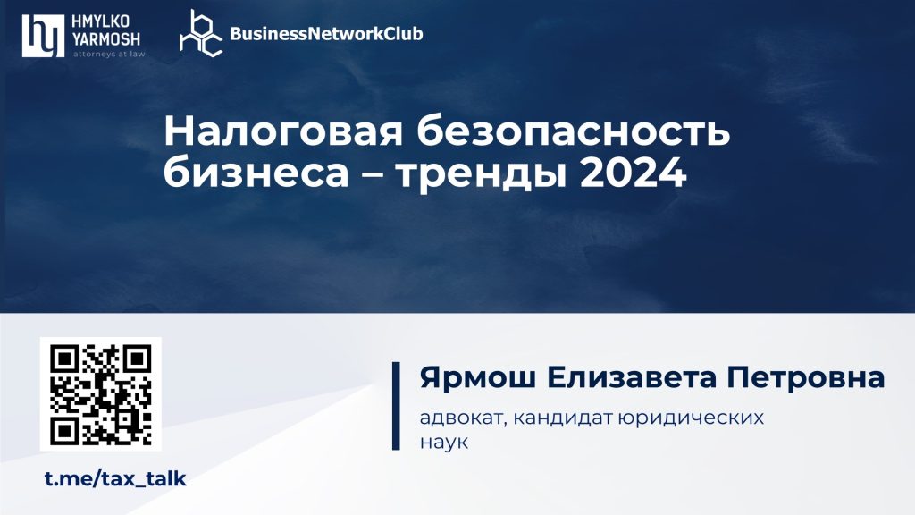 30 мая 2024 года адвокатом Елизаветой Ярмош в BusinessNetworkClub был проведен семинар на тему «Налоговая безопасность бизнеса – тренды 2024 года», где она поделилась своими знаниями и опытом в области налоговой безопасности бизнеса.