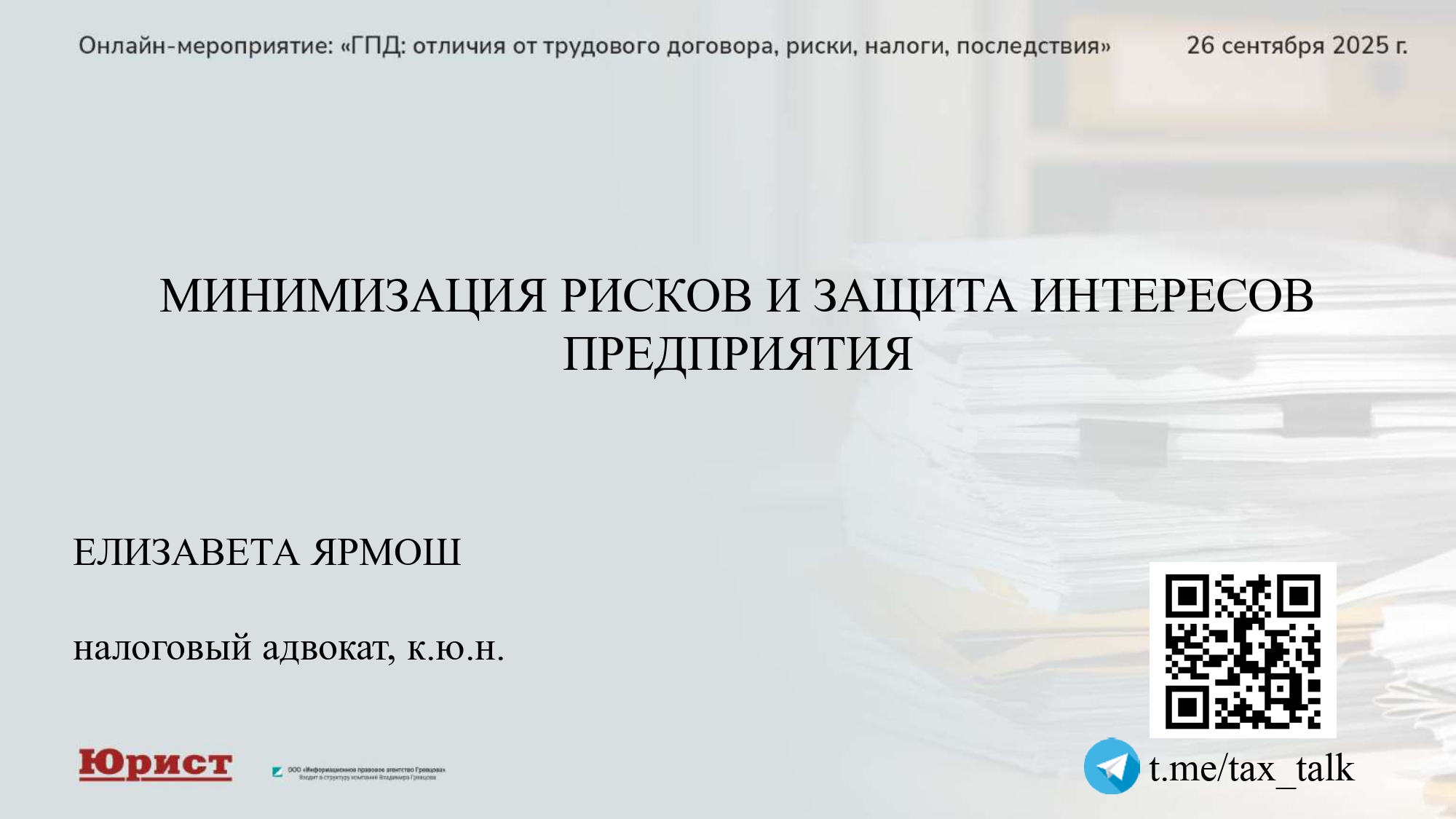 26 сентября 2025 года адвокат Ярмош Елизавета приняла участие в качестве спикера в онлайн-мероприятии «ГПД: отличия от трудового договора, риски, налоги, последствия», на котором рассказала про гражданско-правовые договоры, раскрыла вопросы минимизации рисков и защиты интересов предприятия.