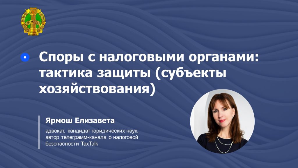 Адвокатом Елизаветой Ярмош 23 апреля 2024 года для Белорусской республиканской коллегии адвокатов был проведен семинар на тему «Споры с налоговыми органам: тактика защиты (субъекты хозяйствования)».